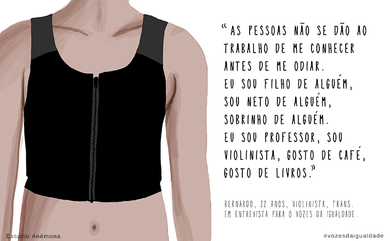 Bernardo Gonçalves cansou de esperar atendimento em um hospital público. Criou uma campanha online para arrecadar dinheiro para fazer uma mamoplastia masculinizadora. Bernardo é um homem trans, e o busto faz-lhe viver encurvado e apertado em uma faixa compressora. A cirurgia lhe permitirá esticar a espinha e caminhar sem dor pela rua, respirar melhor enquanto ensina crianças a tocar instrumentos musicais. Procedimentos ambulatoriais e cirúrgicos de redesignação corporal para pessoas trans são realizados pelo Sistema Único de Saúde (SUS) desde 2008. Mas os hospitais que os fazem são poucos, e a fila é de muitos anos. Além disso, para o SUS, a sexagem do nascimento é quase destino; para que não seja, não bastam vivências como a de Bernardo, é preciso que autoridades biomédicas – psiquiatras, psicólogos, médicos – façam laudos.